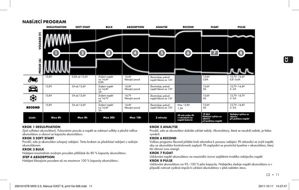Tato univerzální nabíječka akumulátorů je řízená mikroprocesorem a je plně automatická 8kroková. Po dokončení nabíjení se nabíječka automaticky přepne do stavu udržování, nedochází tak k přebíjení a následnému poškození akumulátoru. Nabíječka je určena pro všechny typy 12V olověných akumulátorů. Zajisté oceníte i funkci pulzního nabíjení (Float/Pulse), jež je založena na principu střídavého nabíjení a vybíjení a napomáhá k udržení optimální kondice akumulátoru. Nabíječka je schopna probudit k životu i hluboce vybité baterie a baterie s rozvrstveným elektrolytem.