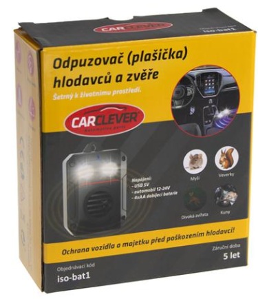 Odpuzovač (plašička) hlodavců a zvěře Žádné líčení speciálních pastí, žádné zabíjení jinak užitečných zvířat! Šetřete životní prostředí! Toto zařízení Vám poslouží k ekologickému odhánění kun a jiné zvěře z vašeho automobilu, zemědělského stroje, garáže i lodě (prokousávání pneumatik a ohlodávání kabelů a plastových částí). Tento přístroj vyhání a odpuzuje nejen hlodavce, ale také kočky a jinou zvěř. Hluk (zvuk), který přístroj vysílá, lidské ucho téměř neslyší. V různých cyklech vysílá tento přístroj velmi vysoký tón (o frekvenci 15-55 kHz). Zároveň odpuzuje pomocí blikajícího zábleskového světla. Tento zvuk a blikající světlo je velmi nepříjemné pro hlodavce a kočky a jinou zvěř, které rychle opustí tímto způsobem chráněný prostor.
