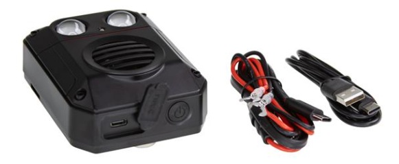 - balení obsahuje: 1x plašičku, 2x napájecí kabel (USB / USB-C, USB-C / svorky k autobaterii, 4x stahovací pásky, návod